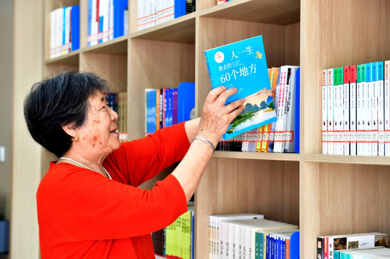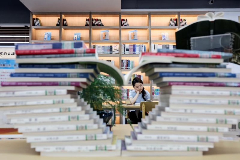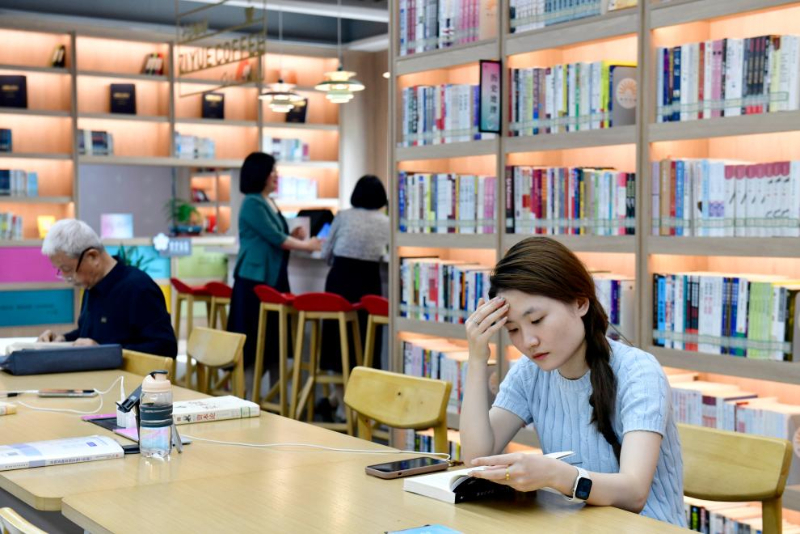 5月23日,在日照市東港區城市書房石臼所館,讀者從書架上取書。