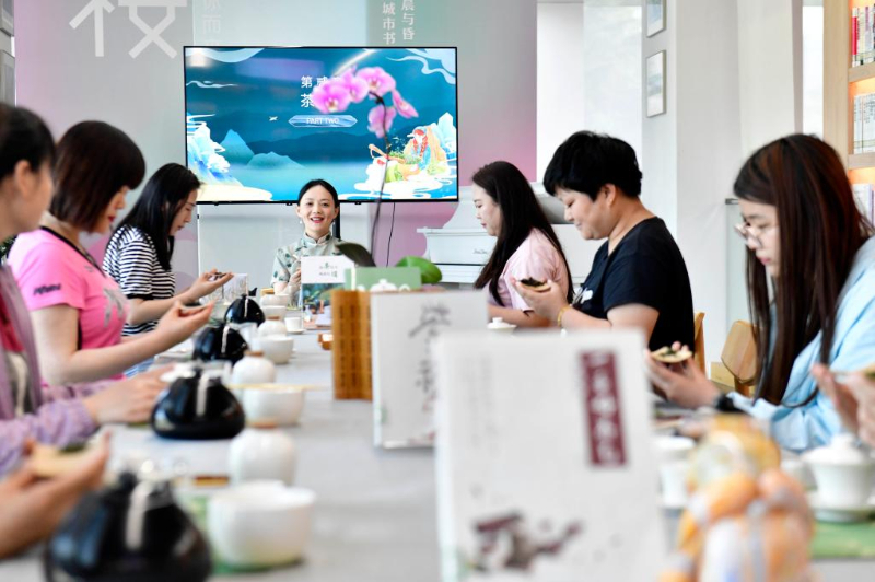 5月23日,市民在日照市東港區城市書房櫻花園館學習茶藝。