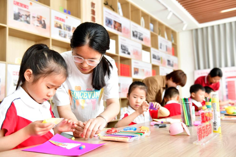 5月23日,在日照市東港區城市書房石臼所館,志愿者在教孩子制作黏土畫。
