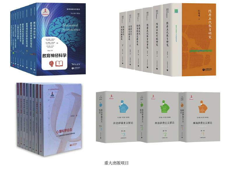 上教社密切關注新時代教育發(fā)展的重大理論問題與現(xiàn)實問題,響應國家教育發(fā)展戰(zhàn)略需求,精心布局學術專業(yè)出版“大項目”,連續(xù)入選國家重點出版物出版規(guī)劃、2013—2025年國家辭書編纂出版規(guī)劃,獲國家出版基金資助。這其中除前文中的大型??乒ぞ邥?,還包括一系列教育與心理學原創(chuàng)研究和前沿研究成果:由中國教育史學者孫培青編著的“隋唐五代教育與考試研究叢書”,構(gòu)建了反映隋唐五代教育與考試全貌的教育理論體系和文獻資料體系,是中國教育史學科建設的一項學術文化積累工程;《中國課程史》以現(xiàn)代課程理論為分析框架,以歷史線索展現(xiàn)中國學校課程的新陳代謝;“教育神經(jīng)科學譯叢”(9冊)是我國首個聚焦教育神經(jīng)科學這一國際教育研究前沿領域的學術譯介系列;《中國傳統(tǒng)德育心理學思想新論》系統(tǒng)挖掘整理中華優(yōu)秀傳統(tǒng)文化中蘊含的德育心理學思想,構(gòu)建中國特色心理學話語體系;我國第一套以大心理學觀,從本土心理學視角系統(tǒng)探索和解讀不同形態(tài)心理學的學術系列“心理學形態(tài)研究系列”(6冊),全景考察心理學的命運與前途,深入探索中國本土心理學的選擇與突破;《弗洛伊德主義新論》(三卷)匯聚國內(nèi)弗洛伊德主義研究領域的權(quán)威學者,歷史展現(xiàn)弗洛伊德理論的百年發(fā)展歷程,提供弗洛伊德主義研究的“全景圖”。這些重大出版項目為構(gòu)建中國特色自主知識體系,建設中國教育學和心理學學科體系、學術體系、話語體系發(fā)揮了重要作用。