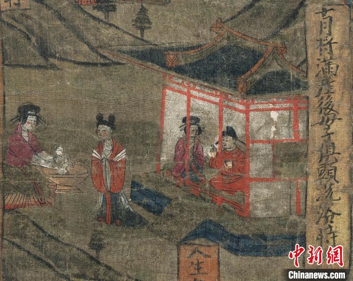 圖為“報父母恩重經變絹畫”中的“十月將滿,產后母子俱顯,洗浴時”的畫面。(資料圖)甘肅省博物館供圖