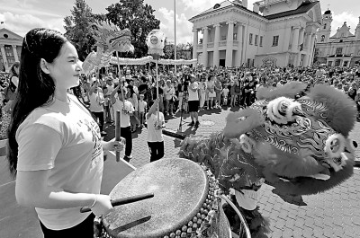 6月1日,白俄羅斯孔子學院師生在明斯克“茶和天下·雅集”活動上表演舞龍舞獅。新華社發