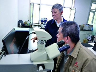 9月26日,敦煌研究院院長蘇伯民(左)與同事一起在實驗室觀察實驗數據。