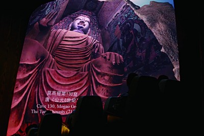 數字電影為游客欣賞敦煌藝術提供了全新的視覺體驗。圖為7月26日,游客在敦煌莫高窟數字展示中心欣賞球幕電影《夢幻佛宮》。