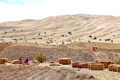 近年來,莫高窟已經逐漸形成風沙危害綜合防護體系,有效減輕了風沙對石窟的影響。圖為7月23日,在莫高窟的崖頂上,工作人員正在鋪設草方格固沙。
