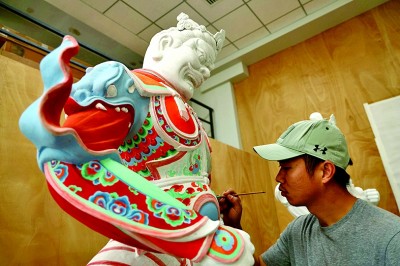 7月25日,雕塑師付祥波在敦煌研究院雕塑室內為塑像臨摹品上色。