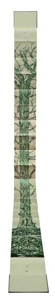 除了材料語言的拓展,展覽中的許多作品還展現出設計形式的創新與突破。如陳潔瑩的《蟬鳴樹語》聚焦了蟬絢爛而短暫的生命軌跡。書籍的裝幀方式采用經折裝,當書本徐徐展開,一棵參天古樹好似拔地而起,貫通全書首尾。由樹根處為起點向上閱讀直至樹冠,可見蟬從卵枝到若蟲,再經歷脫殼變為成蟲的歷程。經由巧妙的形式設計,生命的輪回在書頁間流轉,詮釋出動人的自然之力。