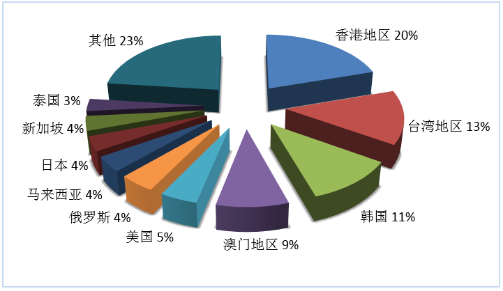 第三季度旅行社入境旅游接待人次排名前十位的客源地國家或地區由高到低依次為香港地區、臺灣地區、韓國、澳門地區、美國、俄羅斯、馬來西亞、日本、新加坡、泰國(見圖2)。