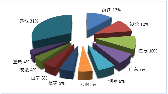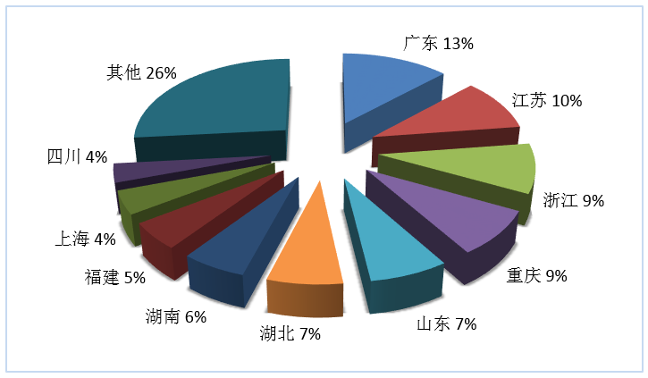 第三季度旅行社國內旅游接待人次排名前十位的地區由高到低依次為浙江、湖北、江蘇、廣東、湖南、云南、福建、山東、安徽、重慶(見圖4)。