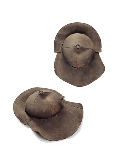 先看前加沿笠帽,大家看是不是有些眼熟?沒錯,這頂帽子與影視劇中英雄俠客們所戴的帽子很相似,《神探狄仁杰》里的李元芳、《水滸》中的林沖外出時就戴類似的帽子。為什么要戴這樣的加沿笠帽呢?為了遮光啊。別小瞧這頂前加沿笠帽,它的背后還有一段歷史故事呢:相傳元世祖忽必烈騎馬射獵時覺得日光太過炫目,聰慧體貼的皇后便為他設計了這種前面加沿的帽子,戴這種加沿帽遮光效果就好多了,忽必烈非常喜歡,便將這種式樣固定了下來,以后國人紛紛效仿,成為流行款式。可是,唐宋是在元之前,元芳和林沖似乎不該戴類似的帽子?既是藝術形象,就不用深究了吧。人類智慧相通,英雄更是惺惺相惜,既都是英雄,戴上同款的帽子也是應有之義。