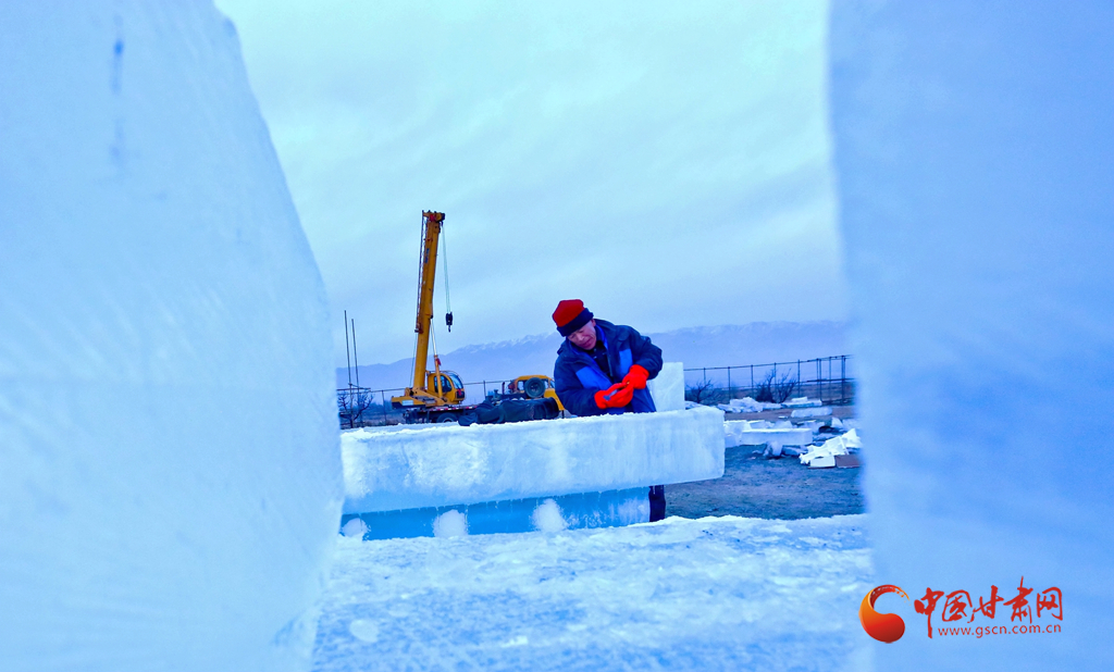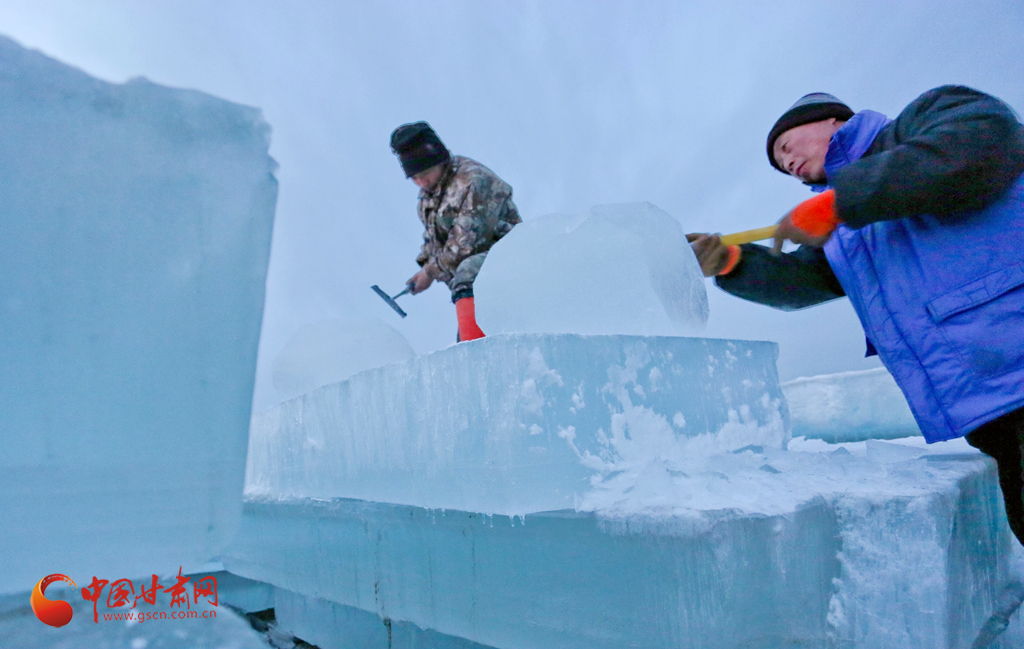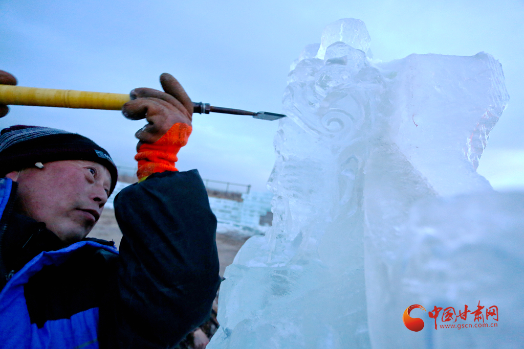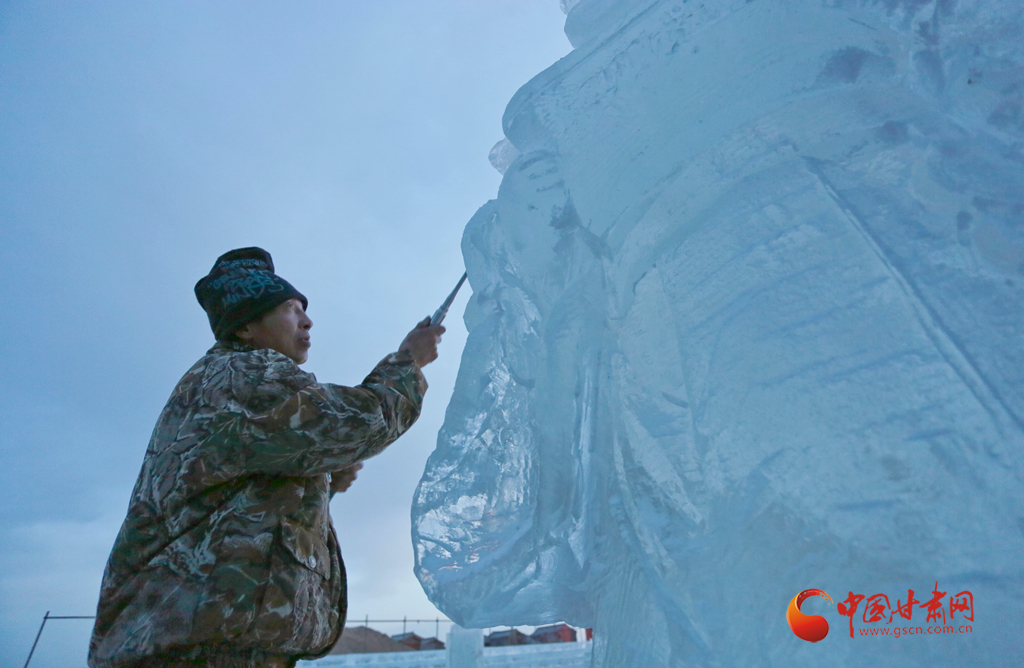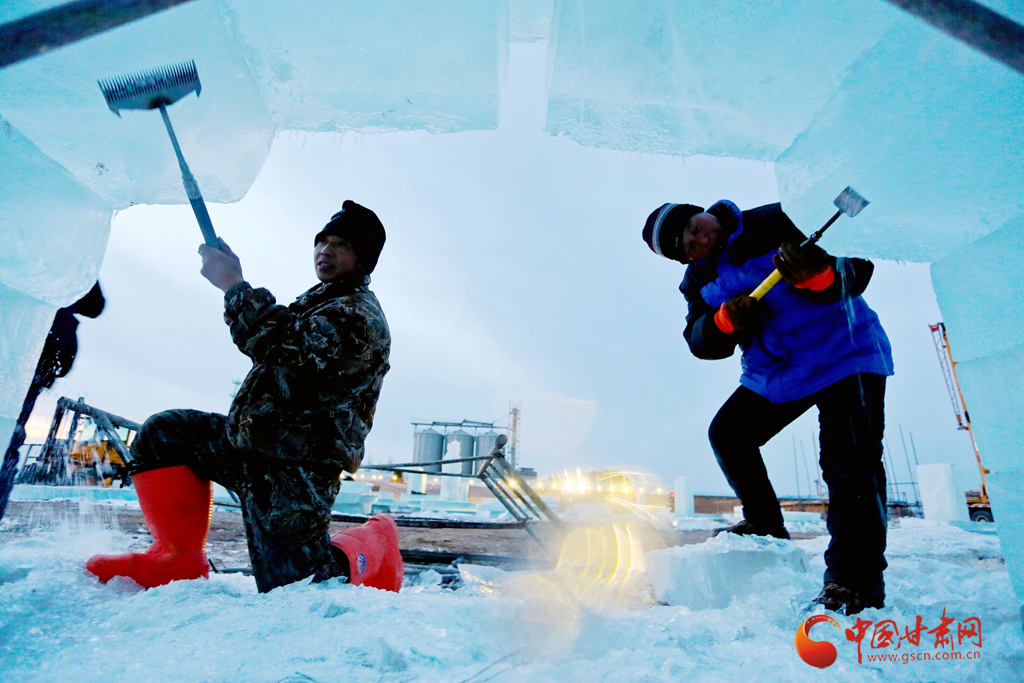 1月11日傍晚,張掖市甘州區屋蘭古鎮九曲黃河燈陣景區冰雕工藝師們正在加班加點趕制大型冰雕。