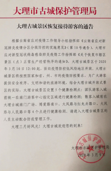 3月9日,云南省大理市古城保護管理局發出通告,宣布大理古城景區于2020年3月10日12:00起,面向疫情防控低風險地區開放。