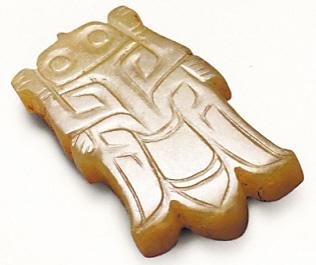 甘肅正寧縣湫頭鄉(xiāng)西侯郎出土的一件漢代豬形玉握,高2.9厘米,長12.1厘米,寬2.4厘米。呈平臥圓柱形,四肢屈于身下。玉豬雄渾博大,用自然豪放的“漢八刀”技法雕出,刻線為一面坡形。可能是墓主人生前喜愛的握玉,死后隨葬。