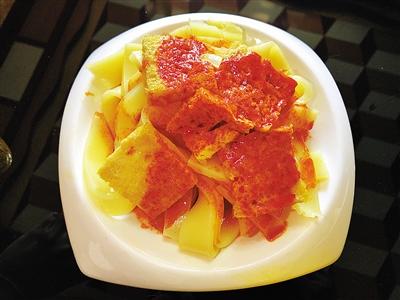 炕鍋洋芋是臨夏農家樂里面常見的一道特色小吃,在臨夏,煎、烙之類的烹飪方式都被稱作炕,炕鍋洋芋因此得名。洋芋切片后,直接放熱油中兩面煎透。炕鍋洋芋的做法雖不復雜,但其對于火候的要求卻極其嚴苛,多一分會焦,少一分則不熟。