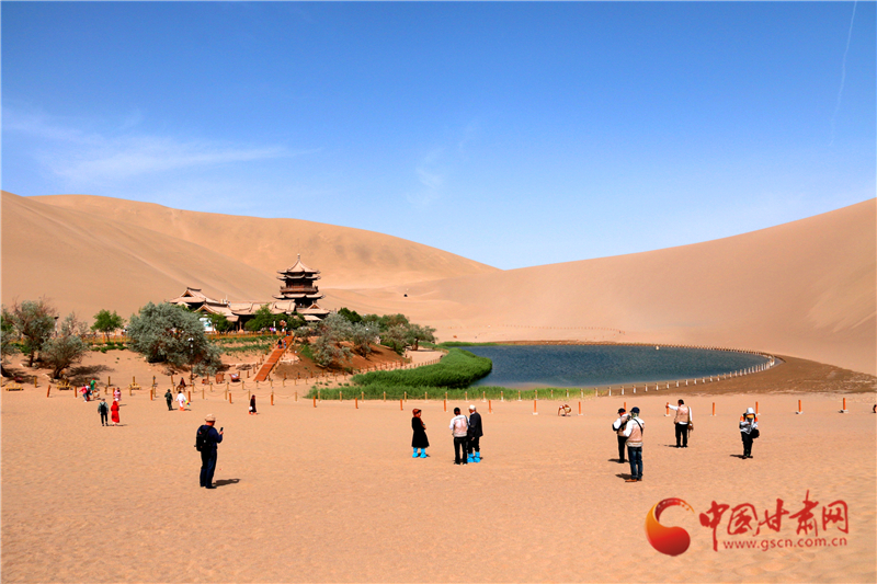 5月19日,游客在甘肅省敦煌市鳴沙山月牙泉景區游覽。