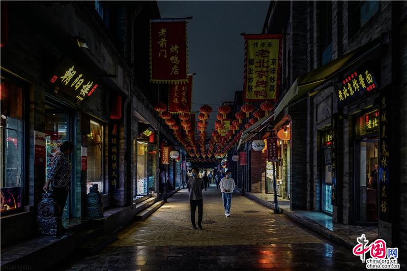昨天(5月21日)下午三點半后,北京的天氣突然由白天變成了黑夜,當時小編正在前門鮮魚口美食街拍攝,光線的明暗變化中,民國風的灰墻青瓦的街道,忽然生出幾分魅惑而神秘的美感,紅燈籠在風雨中搖曳、巨大的京劇招貼畫在墻上,胡同里人影憧憧……