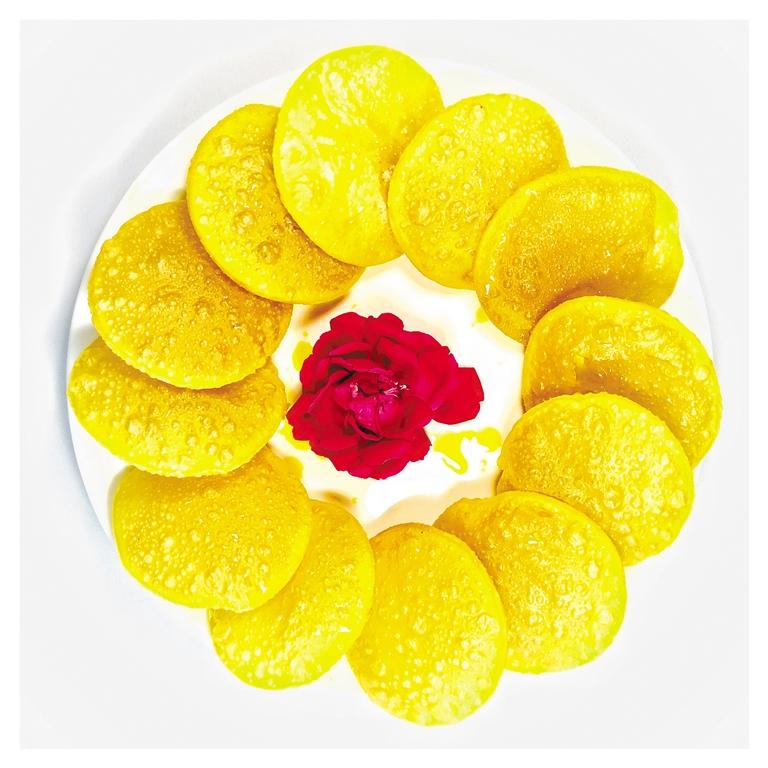 折橋?yàn)车拿媸持校瑺C面油香的地位自比尋常,往往在冷熱拼盤交錯(cuò)中,它已經(jīng)被端上桌,因?yàn)樗钦蹣驗(yàn)橙思抑凶罹呦笳饕饬x的一種食物。油香炸得好不好,就可以衡量出這家農(nóng)家樂廚師的技藝。