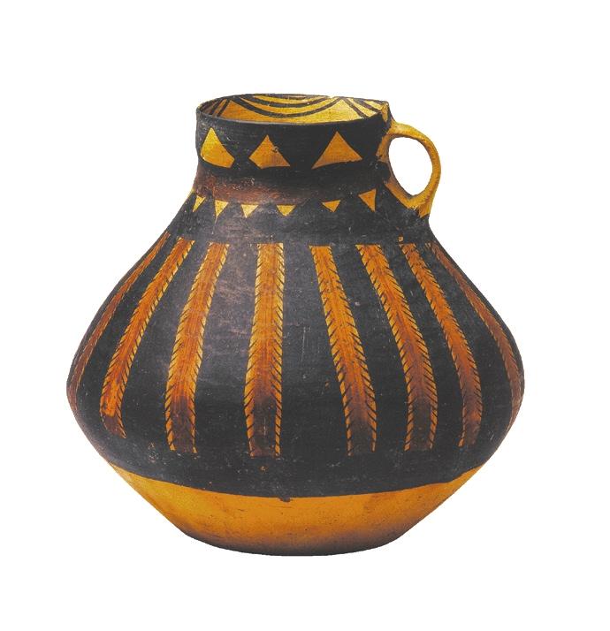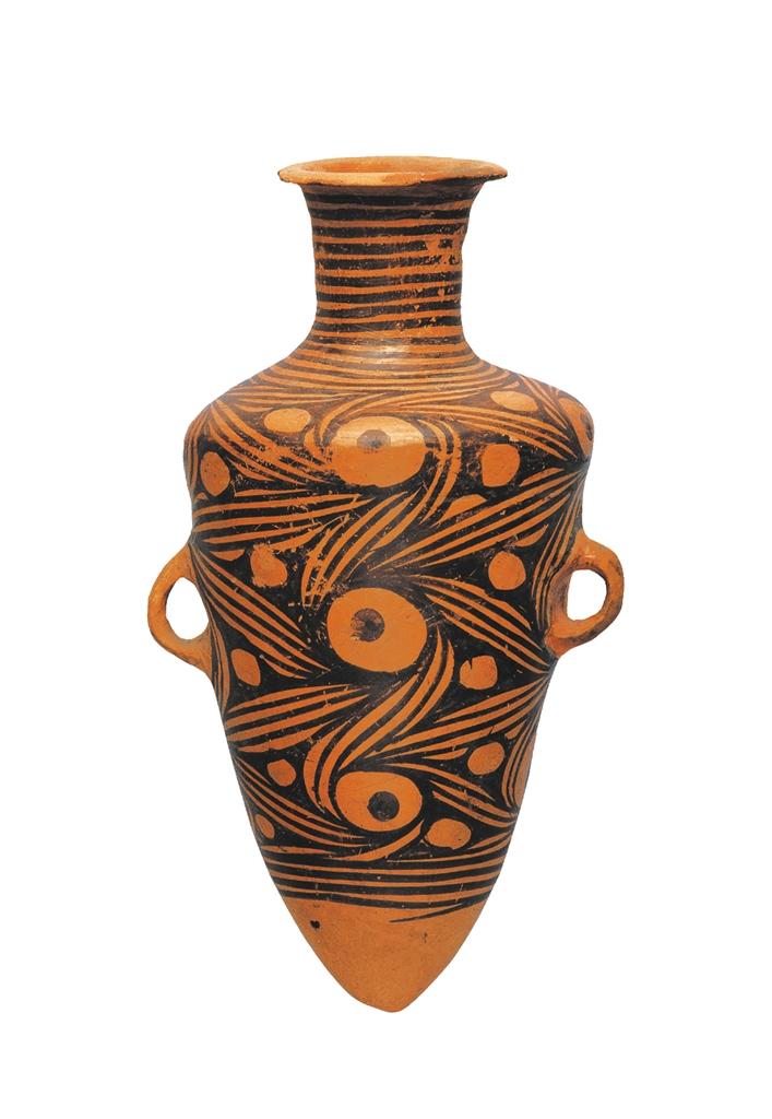 馬家窯文化馬家窯類型(距今約4800年),1971年隴西縣首陽公社呂家坪出土。這只彩陶瓶最亮眼的特點當屬瓶身上三組旋渦紋了,這三組用黑彩繪就的連續旋渦紋與瓶頸的平行弦紋聯系,圖案華美勻稱,連綿不斷卻疏密有致,真難想象,近5000年前的古人繪畫技藝竟如此精湛!這只彩陶瓶另有一個奇特處同學們發現了嗎?此瓶的瓶底為什么是尖的,尖底可怎么置放?想必是用繩子系著瓶的兩耳懸掛著用的。