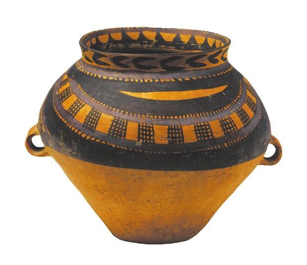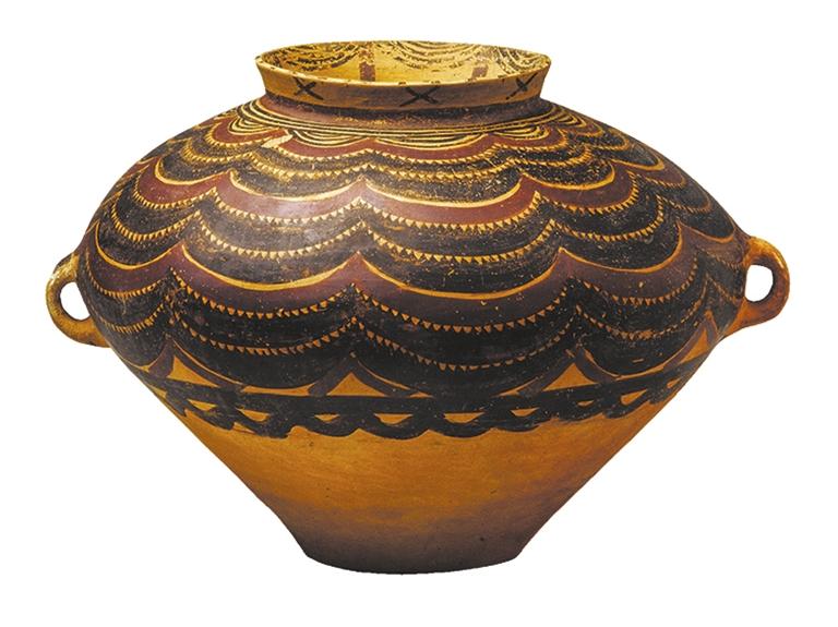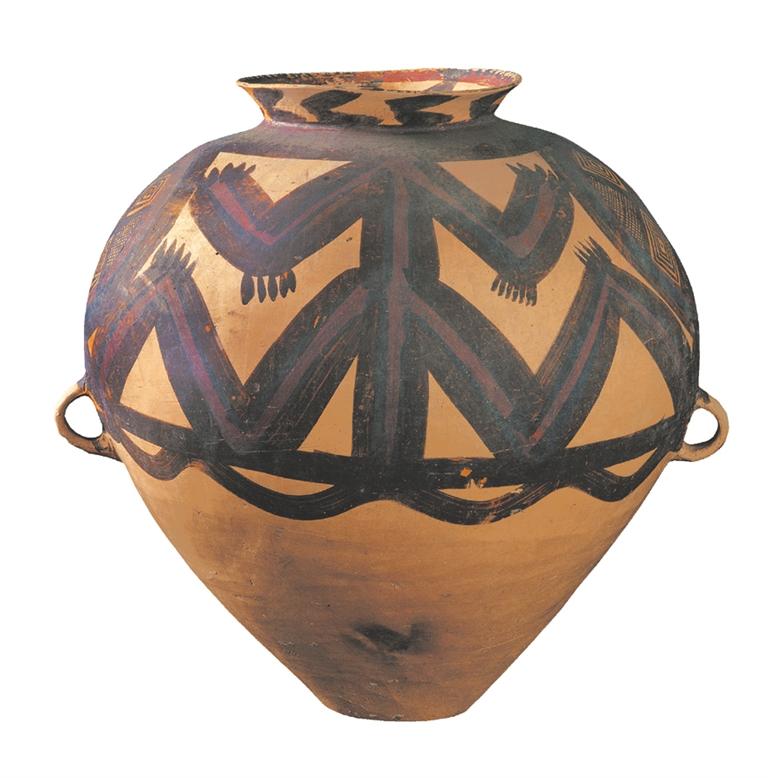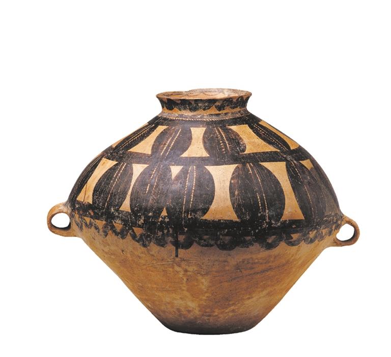馬家窯文化半山類型(距今約 4500 年),廣河縣地巴坪出土。這是雙耳甕器型大氣貴重,施以紅、黑二彩,紅、黑彩交替使用,腹部繪多層連續垂弧紋和鋸齒紋,黑、紅彩交替使用,由三組分層連續的垂弧紋組成整體圖案,每層由兩層黑色帶紋和一層紅色帶紋組成,黑色帶紋上緣繪向上的鋸齒紋。整個圖案密集繁復,俯視猶如一朵盛開的鮮花,造型豐滿,色彩鮮艷。