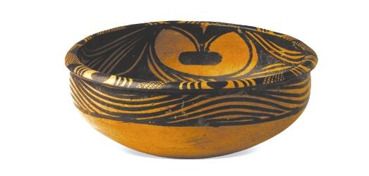 馬家窯文化馬家窯類型(距今約4800年),1966年蘭州市王保保城出土。這是一只工藝精湛,保存完好的彩陶盆,這只旋紋彩陶盆最大的特點是盆內壁上繪的三組變體人面紋,同學們看出這組圖像人面嗎?看懂人面紋需要發揮想象力,總之,我們的先祖抽象表達的能力及想象力真令今人景仰!