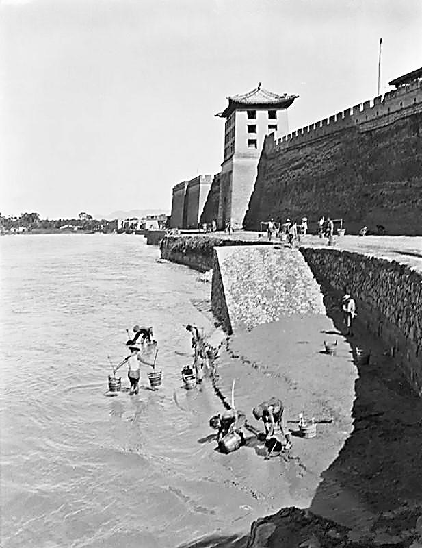 第二張是水客子在黃河中取水的情形。看起來,似乎是黃河大水之后,人們從河中取水。黃河邊的石堤下,堆積的淤泥,還沒有清理。以前,蘭州城墻的位置,就是今天的南濱河路。從淤泥堆積的高度看,這次黃河大水應該不小。