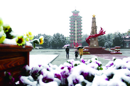 10月27日,游客冒雪參觀甘肅紅軍會寧會師舊址。當日,會寧縣迎來今秋首場降雪。 常琦彪 攝