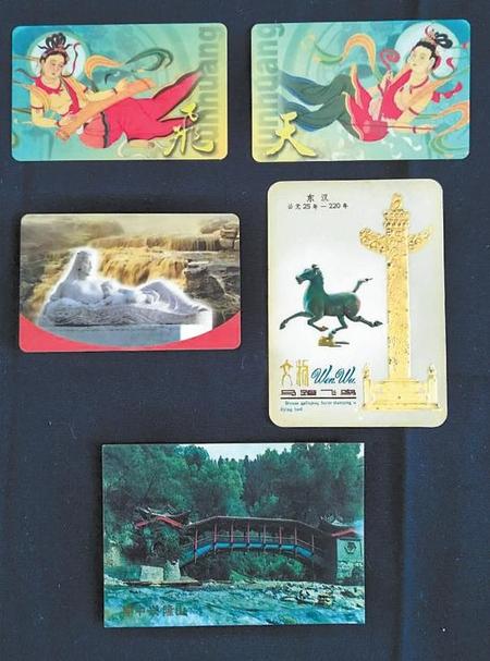 甘肅的自然風光優美,人文歷史悠久,經過不斷挖掘,精心保護,成為人們旅游、觀光的理想之地。北京中鈔信用卡廠于2001年制作的“飛”字片、“天”字片“飛天”對卡年歷片,中國工商銀行甘肅分行于2000年設計了《黃河母親》年歷片,中國農業銀行甘肅分行于1987年設計的《興隆山握橋風光》年歷片,中國遠洋運輸公司上海分公司于1978年制作的《馬踏飛鳥》年歷片,都為甘肅旅游風光作了宣傳。