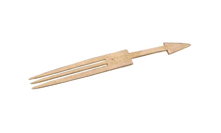 再看一柄骨叉,這柄骨叉同樣是齊家文化時期的產物,距今有4000年之久了,若不是文物標明年代,真不敢相信它是數千年前的先民所制。這柄骨叉長15.8厘米、寬1.8厘米、厚0.2厘米,叉部呈長方形,尖端為三齒,細長方形柄,柄端呈三角形。去掉柄端的三角造型,這柄骨叉與現在餐桌上的叉子有什么分別呢?最難得的是,這柄骨叉制作得如此規整,打磨得這般光滑,想想看,它可是新石器時代先民的手工活,制作竟如此精美,真令人嘆服!