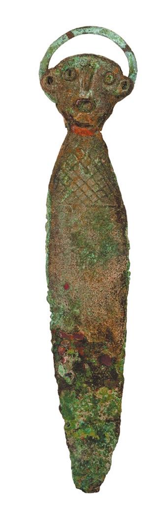 齊家文化,距今約4100年—3700年,是以甘肅為中心地區的新石器時代晚期文化,因為其主要遺址在甘肅廣河縣齊家坪所以得名。齊家文化已經進入銅石并用階段,“環首曲背銅刀”就是齊家文化銅器的典型代表。環首曲背銅刀應該是甘博收藏年代最早的青銅器了,出土于甘肅省康樂縣,這把刀通長18.6厘米、寬2.9厘米、厚0.2厘米、柄長5.5厘米。環首、直柄、凸背弧刃、刀尖略上翹。這把刀除了方便系掛設計的柄部圓環以外,整個造型與西式餐刀并無二致,都是刃根部為刀身最寬處,刀柄處變窄,這樣的設計使得刀的重心落在刃根部偏前,方便切割肉類等食物,乃地地道道的餐刀。