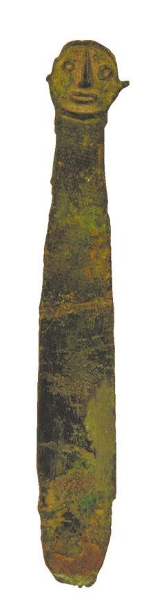 相比刀與叉,匕的出現要稍晚一些,甘肅省博物館收藏有人頭柄銅匕兩把,都是辛店文化(距今3400年—2800年)的產物,兩把人頭柄銅匕都采集于甘肅省廣河縣。一把人頭柄銅匕造型比較拙樸,匕身平直呈長舌狀,末端為圓弧形并微上翹。柄首為人頭形,高鼻,圓眼,厚唇微張,半環形雙耳,一耳殘缺。另一把人首柄銅匕同前一把人頭柄銅匕造型相似,但做工卻要精美許多,這把銅匕柄首也是人頭形,高鼻,圓眼,圓口,雙耳為半環形,頸部涂紅色,身體為方格網紋。這把人頭柄的人面雙目圓睜,嘴微張,一副機靈驚詫的表情,比前一把人頭柄銅匕人面憨直質樸的面目更有意趣。這是兩把還沒成為武器的銅匕,但它已經有了勺子的雛形。