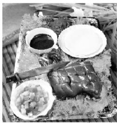 將蕨麻豬除去內臟和頭蹄,然后內涂調料,外裹泥巴,埋入無煙的牛糞火堆中炙烤,至泥呈褐黃色時,豬毛隨泥巴脫落,即可放入大盤,配以佐料,用刀切割而食,肉嫩皮脆,鮮香無比。