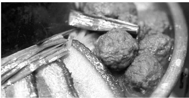 紅燒肉還有番外篇,一碗熬蘿卜燒肉讓此行臻于完美。熬,此處念平聲跟我們通常所說的煮菜有些類似,但不同的是,煮菜用清水,熬菜用肉湯。熬蘿卜會吸收湯的香味,變得軟糯爽口,這也就是熬菜的精妙之處。簡單地爆香蒜苗,加上幾片做好的紅燒肉,蓋在這蘿卜上,于是一碗高端大氣的菜品就出現了。