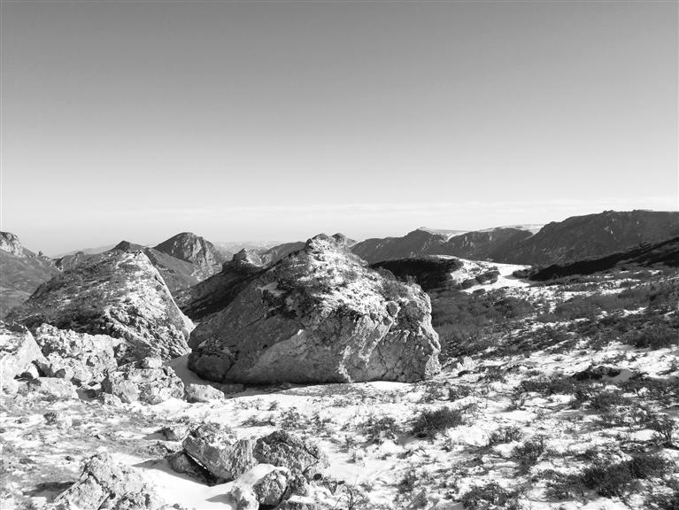 穿過公路就來到露骨山腳下,山間灌木叢生,枯葉凋零,一夜的小雪也使天空更加清澈。上山的路,總體是溯溪而上,不過腳下的小溪已經變成冰河,但潺潺水聲不時在耳邊響起,大小石塊橫亙在冰河之上,白雪覆蓋其間,我們一行沿著前人在雪地留下的腳印,撥開齊胸的灌木枝,深一腳淺一腳、兜兜轉轉向前行。