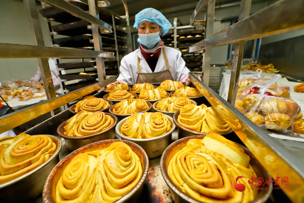 1月6日,甘肅民樂縣隴上鄉村農業科技公司鄉村饃饃加工車間里員工正在精心包裝“花饃饃”。