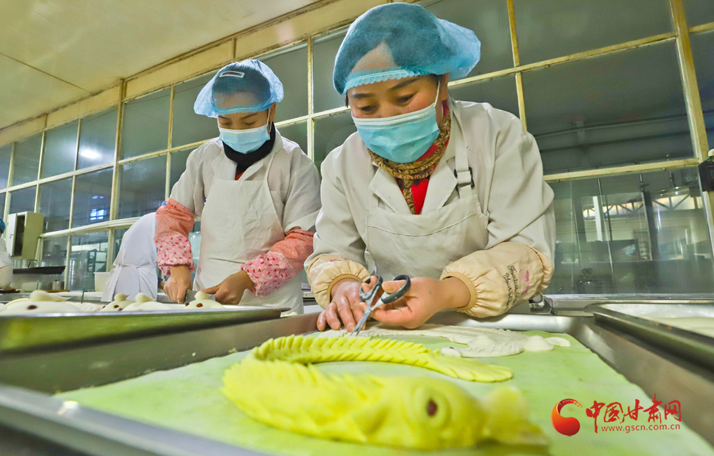 1月6日,甘肅民樂縣隴上鄉村農業科技公司鄉村饃饃加工車間里員工正在精心制作“龍鳳呈祥花饃饃”。