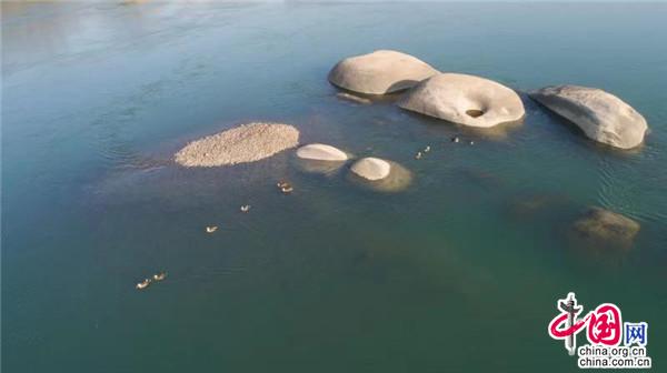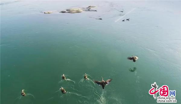 1月12日,在湖南桃江羞女湖國家濕地公園當(dāng)?shù)財z影家協(xié)會成員用無人機有幸拍到一群正在資江戲水的野生保護物種——斑嘴鴨。