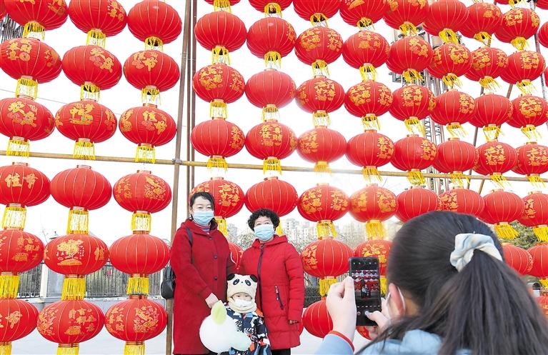 春節臨近,臨夏市街道、社區、公園張燈結彩,處處呈現一派喜慶祥和的節日氣氛。圖為市民們在東郊公園紅燈籠前拍照。 記者 史有東 攝