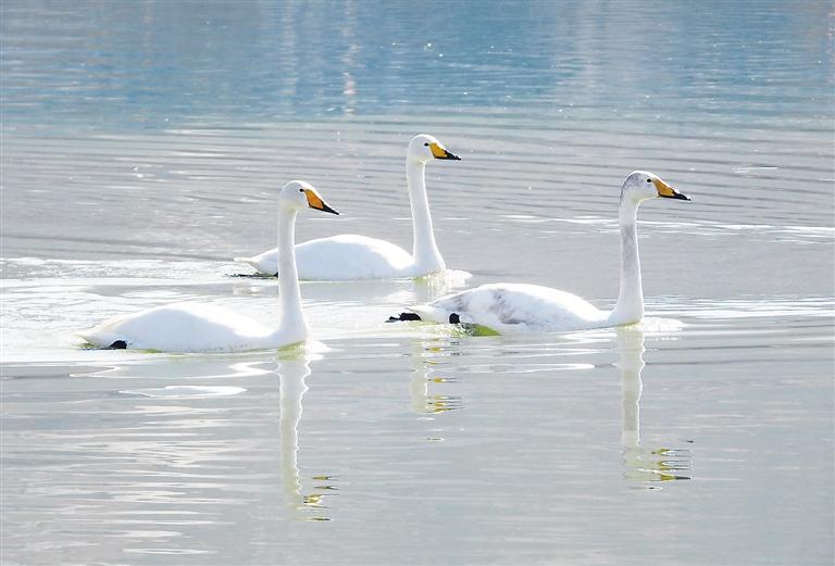 近日,永靖縣鹽鍋峽鎮(zhèn)境內(nèi)的黃河八盤峽水庫(kù)成為天鵝等候鳥越冬的樂(lè)園,它們?cè)诖藯ⅰ⒁捠常蔀槎拯S河里的一道靚麗風(fēng)景。 本報(bào)記者 史有東 攝