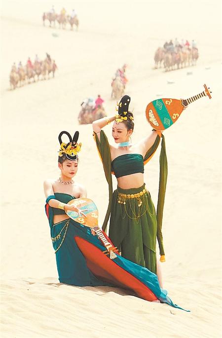 “五一”假期,游客在敦煌鳴沙山月牙泉景區拍照,該景區迎來今年旅游高峰。 新甘肅·甘肅日報通訊員 馬曉偉