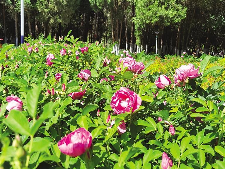 如果您在5月上旬至10月上旬來蘭州,最容易看到的當屬玫瑰花了,它的花朵嬌艷欲滴,不但耐看,還可以吃。四季玫瑰又稱紫枝玫瑰,夏季賞花,秋季看果,冬春觀枝,具有四季觀賞價值。沿著南北濱河路行走,馬路兩旁便可看到許多或盛放或含苞的玫瑰花;小西湖公園內,大片的四季玫瑰如今開得正旺;在北濱河路黃河河道健身步道,多色的玫瑰錯落有致,散發出甜蜜的醉人芬芳;再往山上走,位于羅九公路上的牡丹園內,也有不少玫瑰花正在盛開。