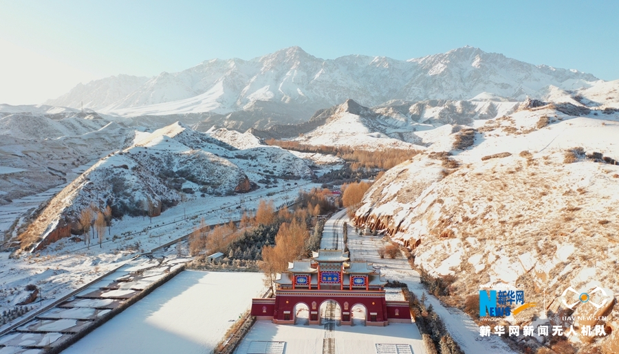 這是11月21日航拍的甘肅省張掖市肅南裕固族自治縣馬蹄寺風景區雪景。新華網發(楊永偉 攝)