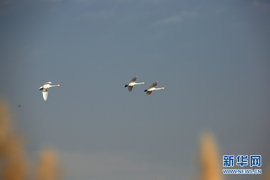 冬日清晨的甘肅省張掖國家濕地公園里碧波蕩漾,成群的白天鵝、黑天鵝等鳥類聚在一起游弋嬉戲,歡騰跳躍,成為一道亮麗的風景線,吸引眾多游客觀賞拍照。新華網發(陳禮 攝)