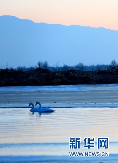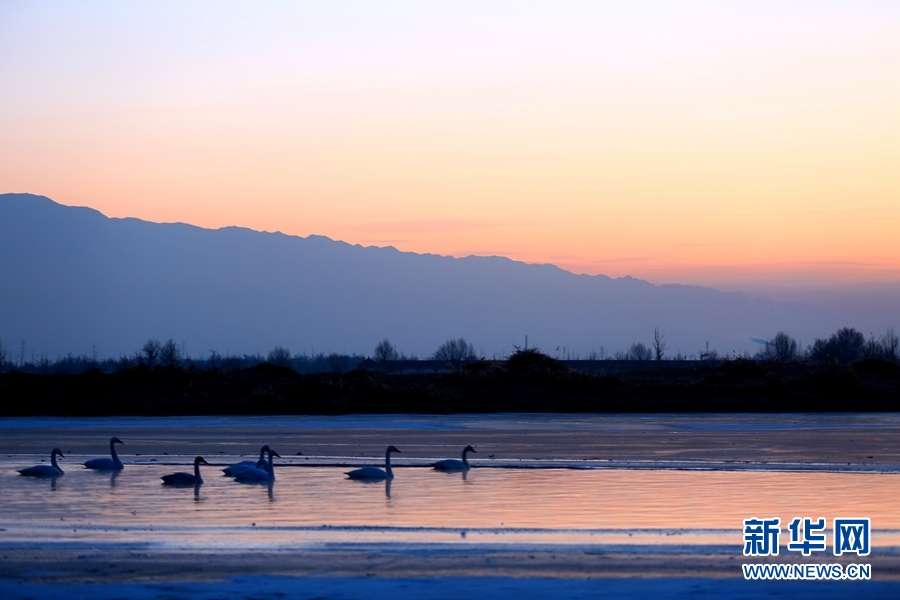 2022年1月2日,晨曦初露的甘肅省張掖市甘州區黑河流域,一群大天鵝在河中棲息、覓食,宛如一幅靜美的畫卷。新華網發(楊永偉 攝)