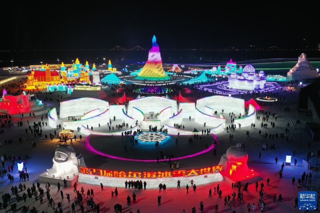 2021年12月25日,游客在哈爾濱冰雪大世界園區游玩(無人機照片)。