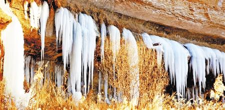 小路隨著山勢,曲折延伸。對面荒坡上隨處可見大大小小的洞穴,不知是經年風蝕,還是人工開采沙子所致。洞穴四周,散落著小小的冰瀑,有的似乎只有盈盈一握。長長短短的冰掛,一綹一綹,一排一排,遠遠近近錯落有致地覆在山坳里,垂在砂石間,掛在懸崖上。一些細細長長的冰溜,像極了臘月里母親剛出鍋的粉條。搭在院子竹竿上的一掛粉條,下邊還垂著水珠,上邊早已凍成了細細的冰棒,而滴落在地上的水已凝成了冰堆。