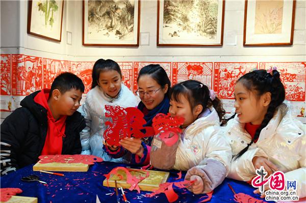 “?;⒆髌废盗卸际俏易约涸O計創作的,一共18款,每款的造型都不一樣。”1月26日,在位于湖南省新邵縣嚴塘鎮大源村的非遺剪紙展覽館,邵陽剪紙非遺傳承人馬麗婭帶著幾名萌娃學習剪紙,為即將到來的虎年春節增添一抹喜慶。