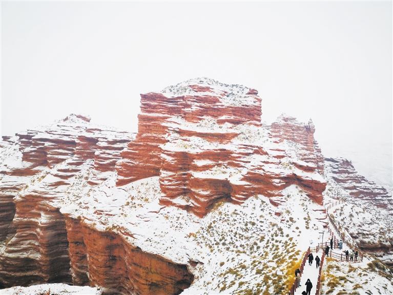 游客在景區觀景臺上伸手可觸摸到被白雪覆蓋的火紅色彩,峽谷內,山倚壁蜿蜒,峰隨地勢崢嶸,石林犬牙交錯,游客不時發出由衷的贊嘆,眼前的風光如仙境一般。