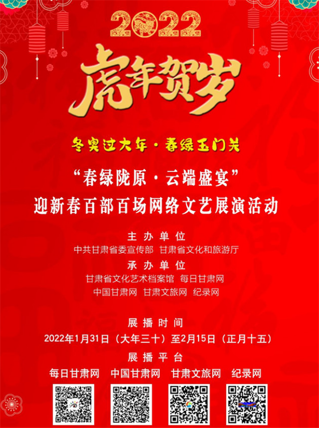 甘肅省博物館在春節期間舉辦了“虎虎生福——壬寅(虎年)新春生肖文物聯展”,甘肅省圖書館舉辦7大專題30余項文化體驗活動。在“春之華章”2022年甘肅省電視春節聯歡晚會上,原創話劇《八步沙》、隴劇《大禹治水》等精彩上演;甘肅省非遺保護中心開展了“虎虎有神過大年——如意甘肅·多彩非遺”宣傳推廣活動;甘肅演藝集團通過線上線下結合方式,開展2022“我們的中國夢”——文化進萬家迎新春文藝演出活動;張掖市舉辦春節“九曲黃河燈陣啟燈納福非遺文化展演”活動。