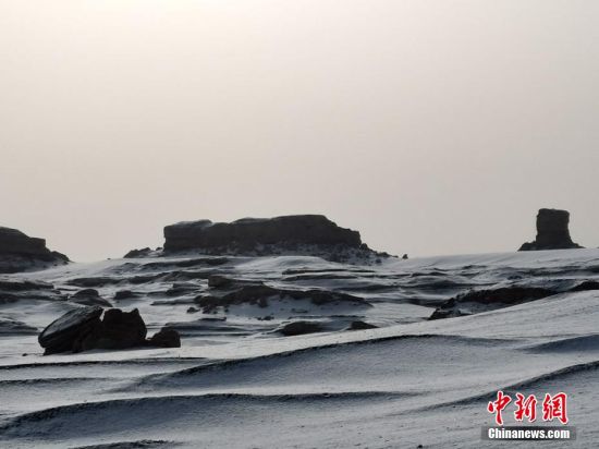 俗話說“春雪貴如油”,被稱為“中國最干旱的地方之一”的甘肅敦煌大漠落雪是一件十分稀罕的事兒。潔白的雪花漫天飛舞,千姿百態的雅丹在皚皚白雪的映襯下,愈發顯得栩栩如生。
