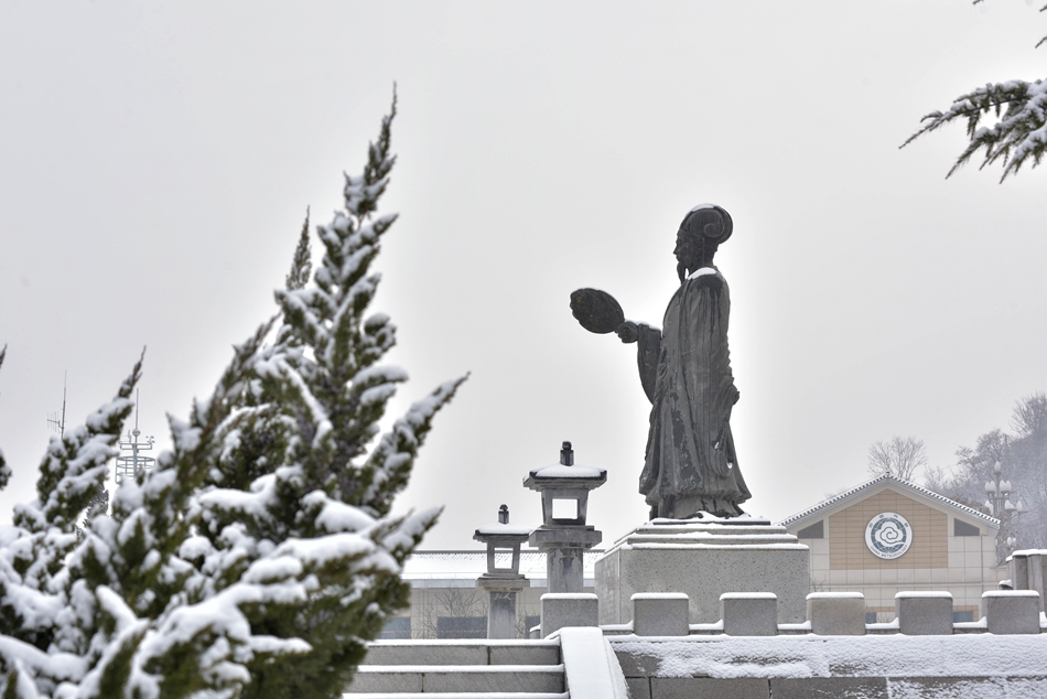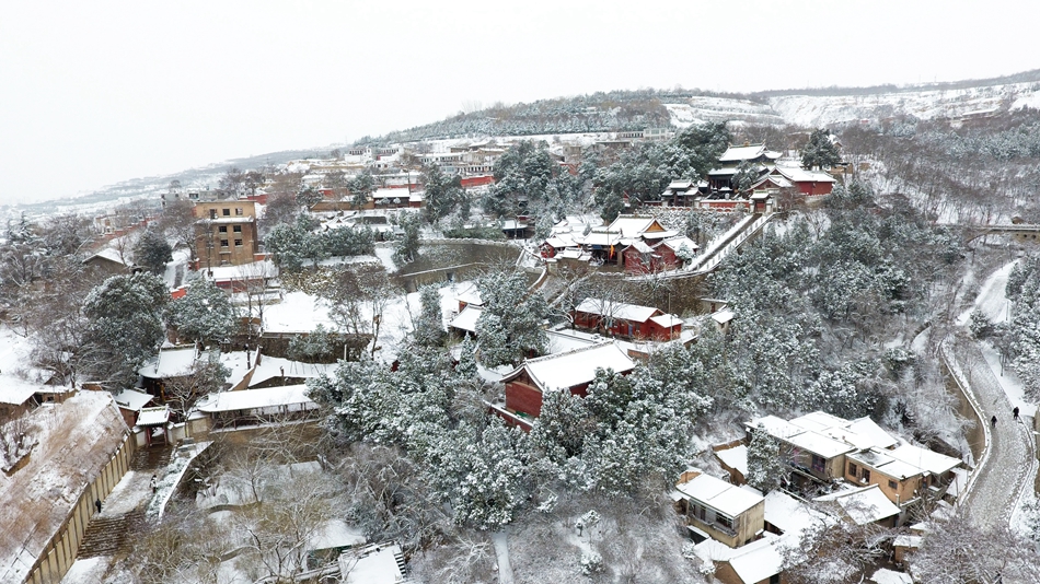 群峰環列,渭水在南北兩山間由西向東流過,形成一幅天然的太極圖。雪中透出大地色的樸拙,給予山川大地最初的模樣,層層繞繞的山路,修葺出渾然天成的萬物法則,也訴說著亙古不變的始祖智慧之起源。